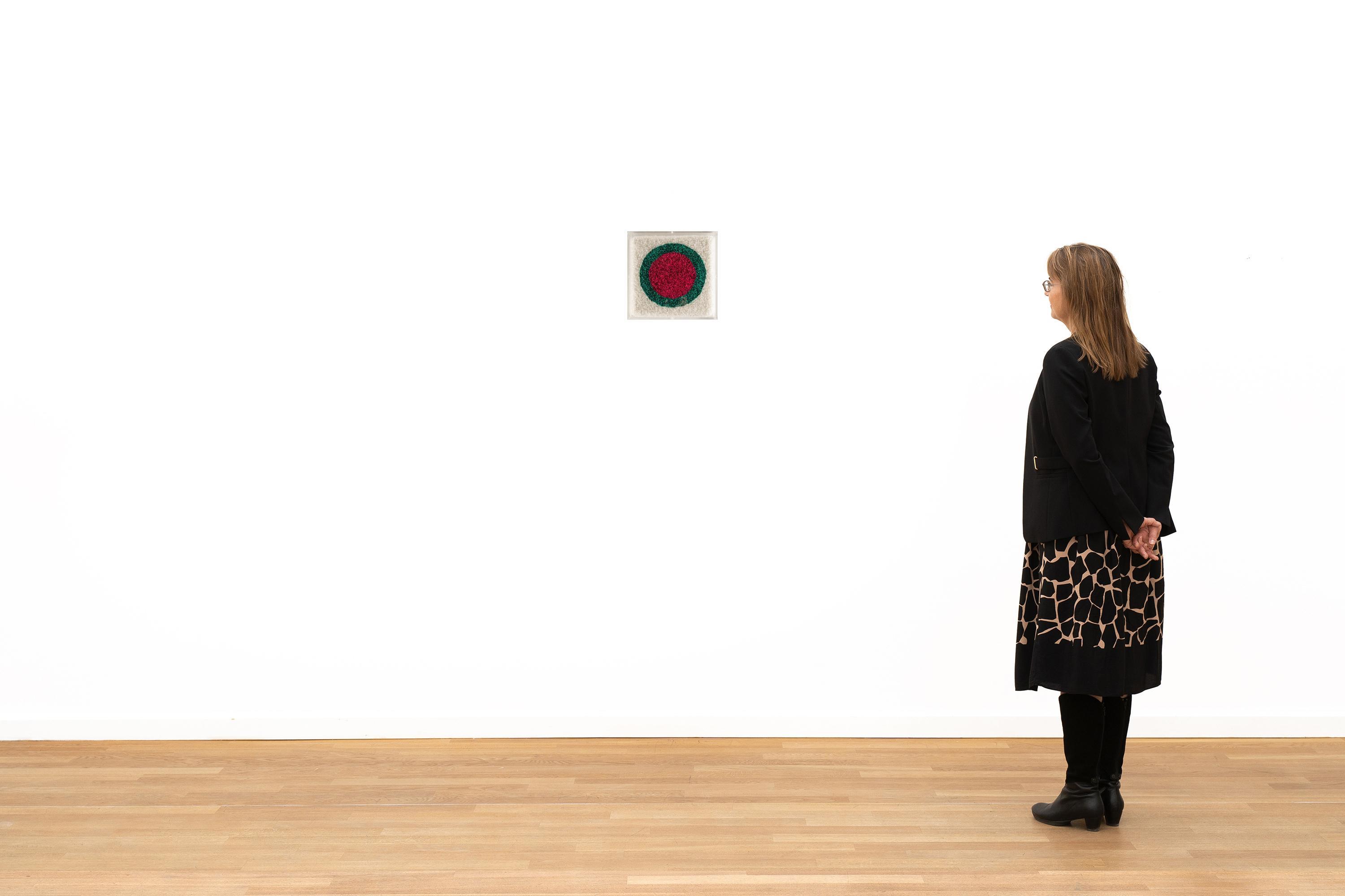 Zur Katalogisierung nicht ausgerahmt. Plexiglasrahmen partiell mit winzigen Klebespuren an den Schnittstellen und minimalen Fleckchen. Ein kaum wahrnehmbares rotes Papierfragment hat sich im unteren Bereich gelöst (wohl Atelier). Insgesamt in sehr gutem Zustand.
